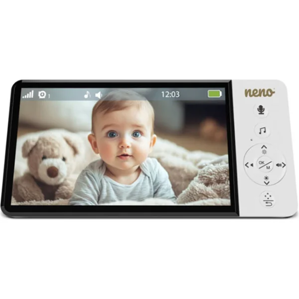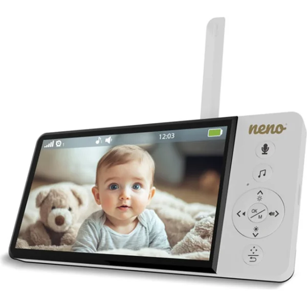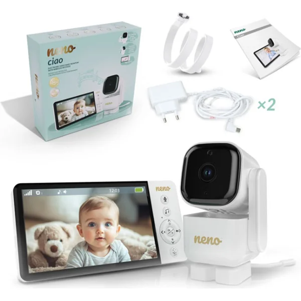 Neno Ciao est un babyphone vidéo électronique moderne avec récepteur sans fil et écran de 5 pouces. Grâce à la caméra rotative avec fonction Pan & Tilt (355° horizontal, 90° vertical), vous pouvez surveiller toute la pièce depuis le confort de n’importe où.