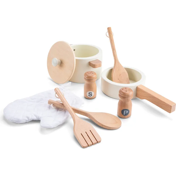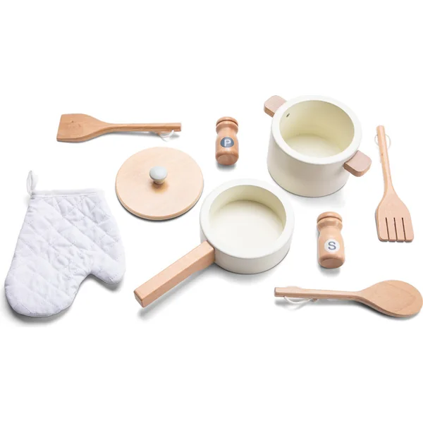 Dans le set, vous trouverez également 3 ustensiles de cuisine en bois, un gant de cuisine, un saloir, un poivrier et deux casseroles avec couvercle – tout ce dont les petits chefs ont besoin pour préparer de délicieux repas.