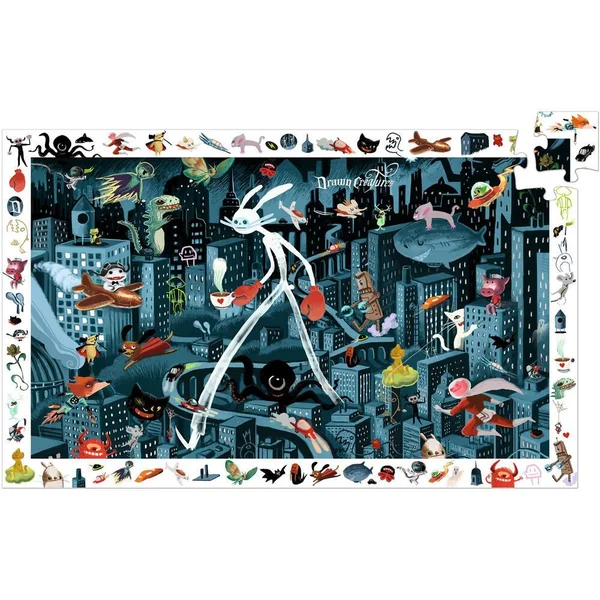 Un puzzle de 200 pièces pour découvrir une ville de nuit, où voltigent de drôles de personnages. L’enfant crée son puzzle, puis s’amuse à retrouver dans l’image les éléments de la frise.