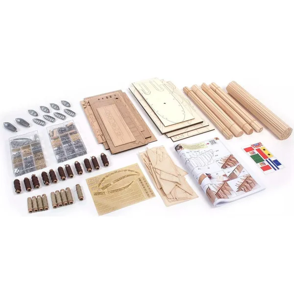 L’emballage contient des pièces en bois découpées au laser, des lattes, un pont, des mâts, des pièces en bois, des pièces en métal coulé, des pièces en laiton, des photodécoupes en laiton, du gréement, des voiles cousues, des drapeaux, un support. Manuel et plans de construction.