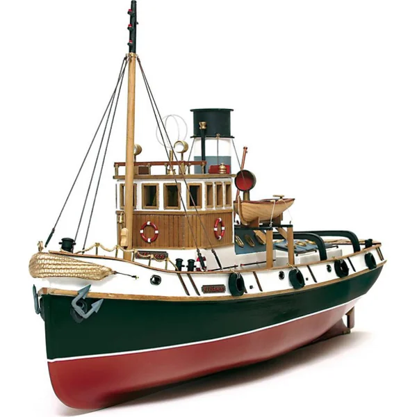 Le modèle Ulises représente un remorqueur océanique. Dans les années soixante, les liaisons commerciales maritimes étaient particulièrement intenses et le transport de marchandises à travers les mers et les océans du monde était continu. Cependant, cette activité n’était pas sans risques, c’est pourquoi le travail des remorqueurs océaniques était vital – ils aidaient tous les navires qui avaient subi des accidents. À cette époque, le matériau de construction de base était le métal, complété par une certaine quantité de bois. Les constructeurs utilisaient la résistance de l’acier pour la coque et le confort du bois pour les espaces de vie de l’équipage, créant ainsi des navires d’une beauté exceptionnelle, bien qu’ils soient destinés à des fins de travail.