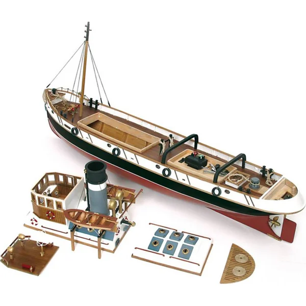 Le paquet contient des pièces pour la construction – pièces découpées au laser, baguettes, photodécoupes en laiton, cordages et autres. Il comprend les éléments techniques suivants pour le contrôle à distance : hélice de bateau / arbre d’hélice de bateau / support d’arbre avec roulements auto-lubrifiants / gouvernails avec mécanismes de fixation à la coque et servo.