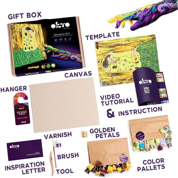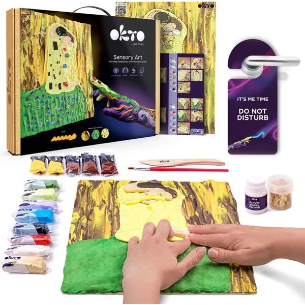 Le kit créatif 3D « Sensory Art – The Kiss » est destiné aux adultes qui recherchent une oasis de paix et de créativité dans un monde rapide et pressé. Ce set de modélisation 3D vous offre la possibilité de créer votre propre version de la célèbre œuvre d’art pleine de passion et de couleurs grâce aux touches de vos doigts. Le kit contient tout le nécessaire pour créer l’image : une toile naturelle, un guide, un outil de modélisation en bois et de l’argile aérée. Une recette unique pour une pâte autodurcissante qui ne colle pas aux mains et ne laisse pas de traces garantit une application simple et agréable. Les couleurs se mélangent magnifiquement, créant des transitions fluides qui animeront chaque détail de l’œuvre. Touchez et façonnez les différents éléments de l’image, ressentez la texture de la toile et laissez-vous emporter par l’art et la créativité. L’image créée, une fois sèche, enrichira l’intérieur de votre maison avec une pièce d’art originale, qui sera également le reflet de votre personnalité et de votre passion créative.