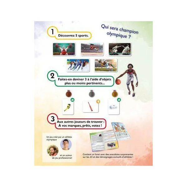 À travers un jeu original d’association d’idées, découvrez les différents sports olympiques et paralympiques. Imagination, déduction et prise de risque sont les trois ingrédients nécessaires pour briller à ce jeu !