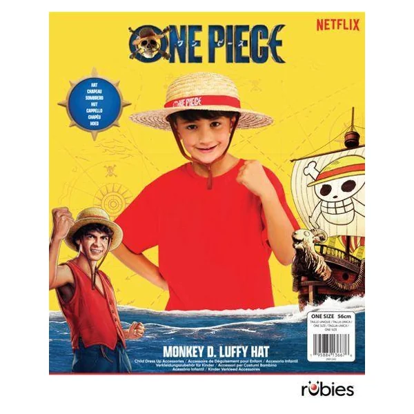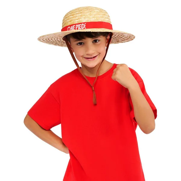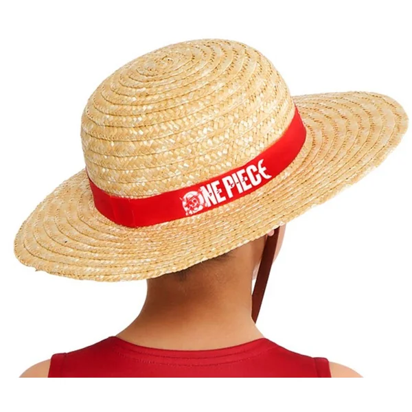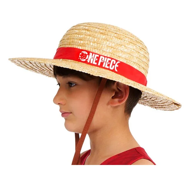 Un chapeau Luffy type cannotier en paille avec bandeau de tissu imprimé One Piece et lien d’attache.