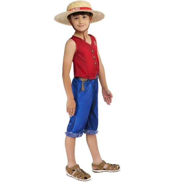 Un top sans manches imprimé avec logo One Piece. Un pantalon imprimé effet jean avec franges. Un chapeau type canotier en paille avec logo One Piece.