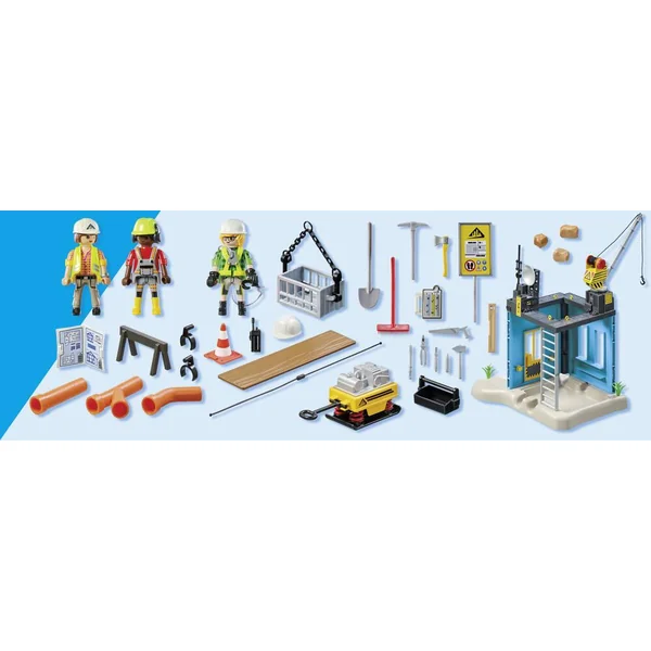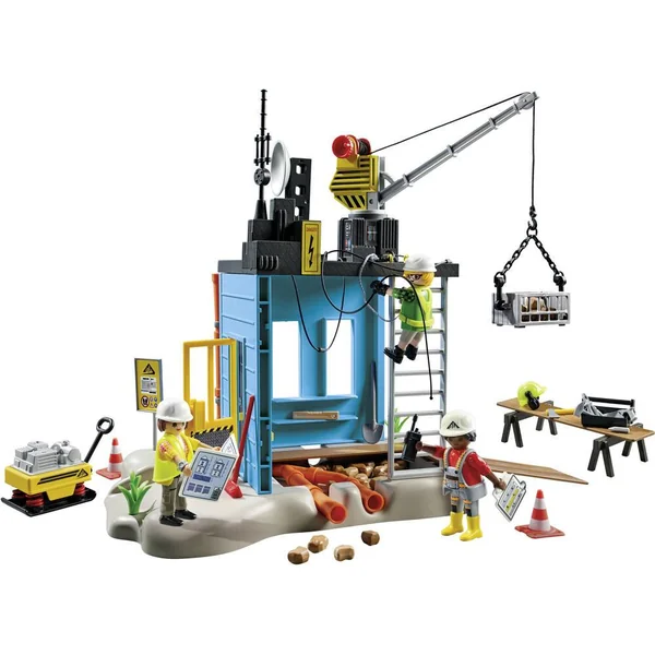 On a du pain sur la planche ! Comprend trois personnages, un bâtiment avec une grue de construction sur le toit et des accessoires de construction.