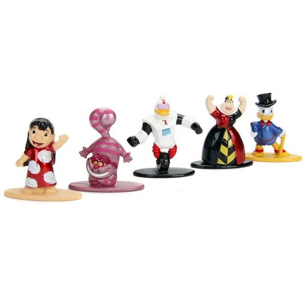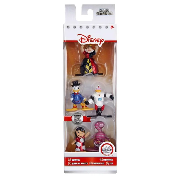 Pack de 5 figurines Die-Cast Nano Metalfigs Disney, version pack A, vague 2 : Picsou, Gizmoduck classic, La Reine de cœur (Queen of hearts), Le Chat du Cheshire et Lilo. En métal. Hauteur d’une figurine : 4,2 cm environ.