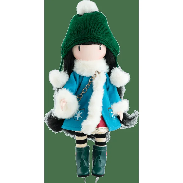 La poupée Gorjuss Santoro The Ice Dance est habillée d’un manteau turquoise avec un col en fourrure blanche, d’une jupe rouge, de patins verts et d’un bonnet blanc avec un pompon. Elle a de longs cheveux noirs et tient un petit sac blanc en fausse fourrure. Elle est fabriquée en vinyle, a des membres articulés et dégage un léger parfum de rose et de chèvrefeuille.
