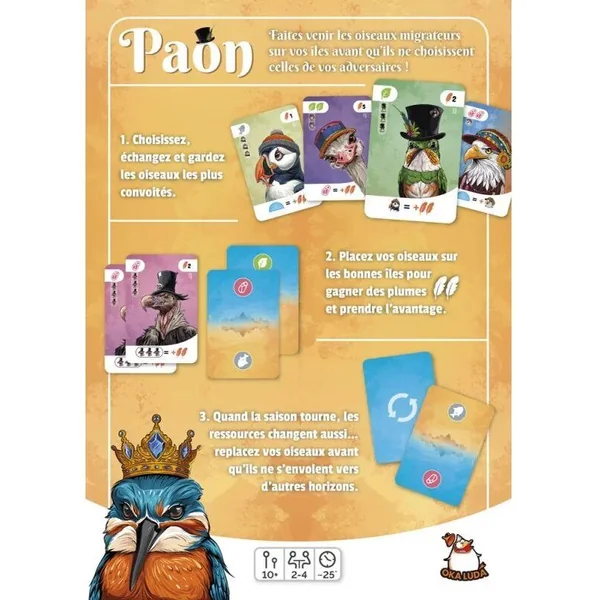 Bienvenue dans Paon, un jeu élégant et stratégique au cœur d’un archipel vivant Développez vos îles, attirez des oiseaux migrateurs et optimisez vos ressources au fil de trois saisons dynamiques.