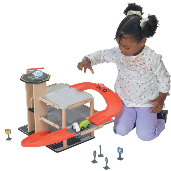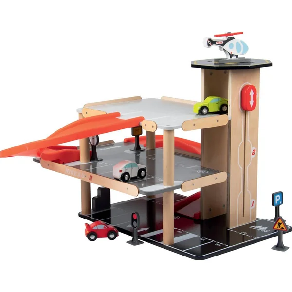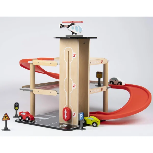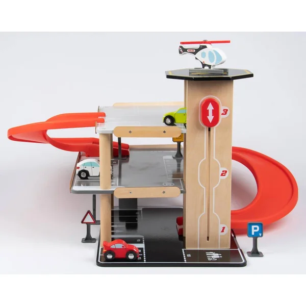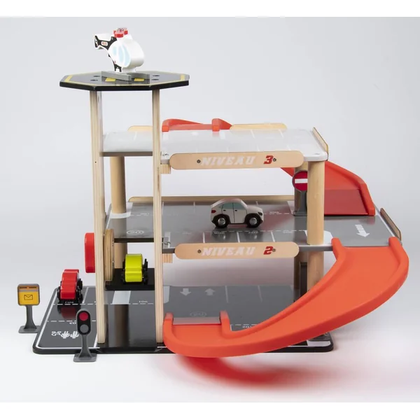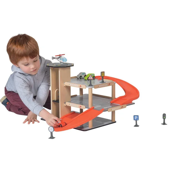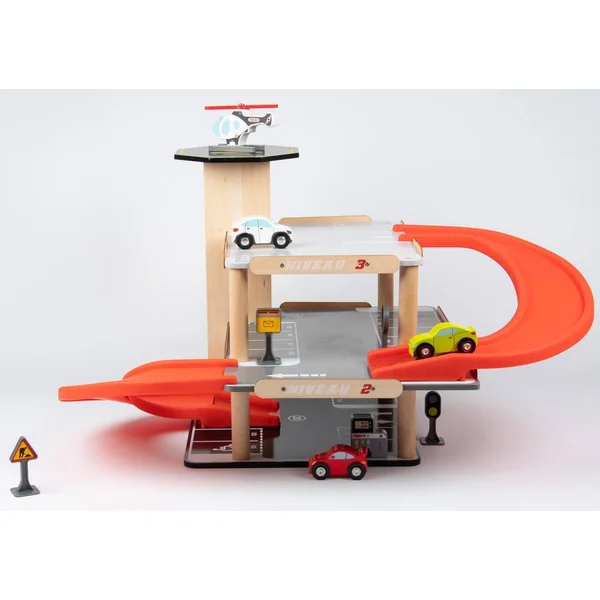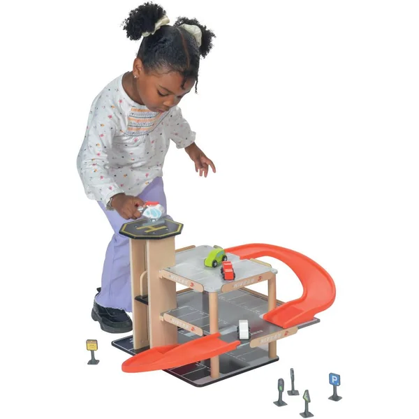 Parking sur 3 niveaux avec ascenseur. Livré avec 3 voitures, un hélicoptère, une pompe à essence et des panneaux de signalisation. Facile à monter. Notice de montage incluse. Développement de l’imaginaire. Apprentissage des objets. Léger et facile à manipuler. Matière(s) du produit : garage et véhicule en bois, rampe et panneaux en plastique. Parking 3 niveaux avec ascenseur, station-service et héliport de secours. 27 places de parking numérotées dont 1 place pour personnes à mobilité réduite et une place pour une famille sur 3 niveaux. 1 rampe pour lancer les voitures. Ascenseur pour voitures qui permet de monter jusqu’au 3ème niveau. 1 station-service. 1 héliport sur le toit de la tour. 3 petites voitures et un hélicoptère. 5 panneaux de signalisations avec stickers.