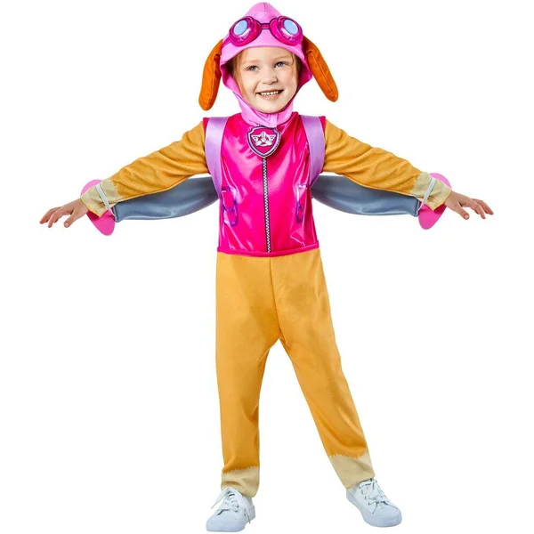 Une robe tutu en tissu satiné rose imprimée sur le haut. Jupon en tulles et insigne de Stella sur le col. Manches froufrous en tulles. Capuche avec lunettes d’aviatrice et oreilles de chien en mousse rembourrées. Une paire d’ailes en tissu avec double anses et ceinture.