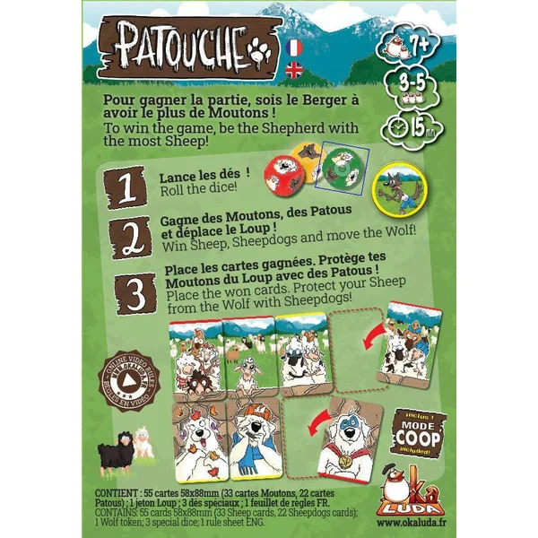 Dans Patou’che, chaque joueur incarne un berger qui rêve d’avoir le plus gros troupeau de moutons. Mais attention au loup qui rode, lui aussi aime bien les moutons, mais pour les manger ! Durée de la partie 30 minutes. Nombre de joueurs 3 à 5.