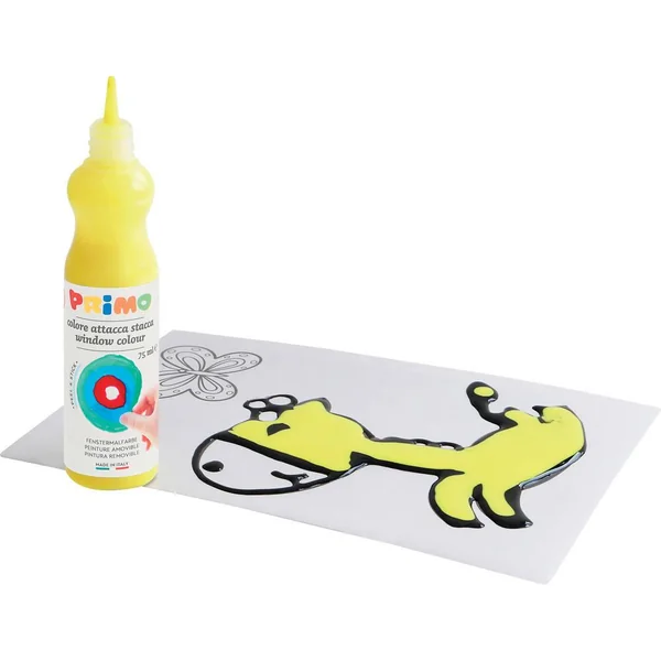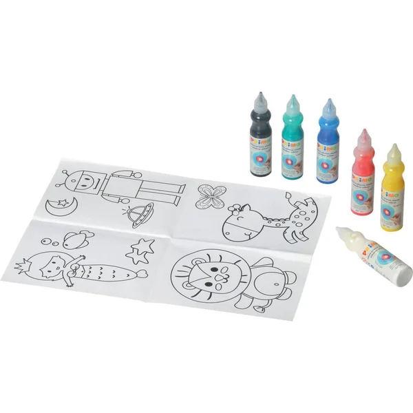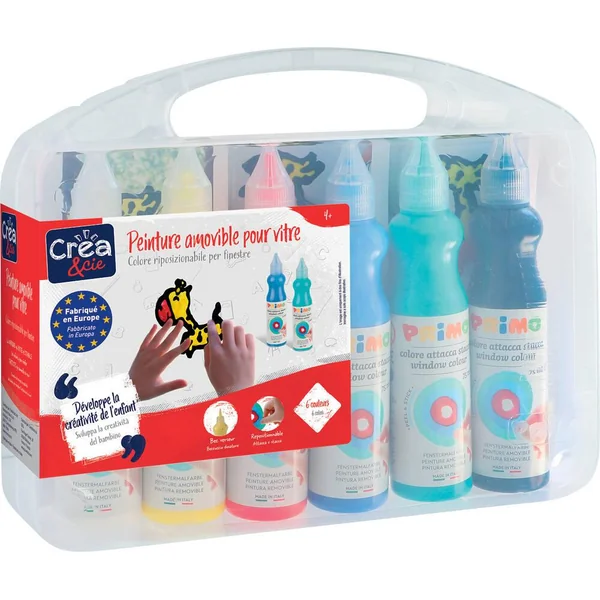 Peinture amovible pour vitre. Inclus 6 flacon de 75 ml avec bec verseur, soit 6 couleurs différentes. Mallette multifonction avec 1 toile plastifiée 42 x 29,7 cm avec notice d’utilisation. Tu n’as jamais pensé à une peinture 3D ? Cette magie te plaira : une peinture que tu peux étaler et doser avec son bouchon doseur spécial. En séchant, elle devient une pâte que tu peux faire adhérer sur différents supports ! Dans la boîte tu trouveras de quoi expérimenter la technique. Peinture amovible en flacon avec bouchon doseur, en 6 couleurs. Mallette multifonction avec 1 feuille spéciale d’instructions plastifiée à utiliser comme nappe de protection et pour dessiner dessous. C’est une émulsion acrylique colorée de haute qualité pour créer des motifs réutilisables. La peinture s’applique avec le doseur du flacon et quand elle sèche elle donne vie à des formes qui peuvent tenir sur n’importe quelle surface. En appliquant la peinture sur une feuille transparente, on peut calquer à loisir un dessin placé dessous. Les couleurs peuvent être mélangées entre elles avec l’aide d’un cure-dents : les résultats obtenus sont toujours très intenses, transparents et brillants. Quand elle sèche la peinture n’est pas lavable. Développement de la créativité. Pratique tout se range et se transporte dans la mallette. Fabriqué en Italie. Dimensions de la mallette 23 x 18 x 5.5 cm.