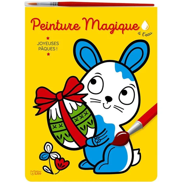Des dessins magiques autour de Pâques : des œufs en chocolat, des lapins, des poussins, des cloches et des poules. Lorsque l’enfant passe son pinceau, trempé préalablement dans l’eau, sur les dessins, les couleurs apparaissent comme par magie : c’est magique !