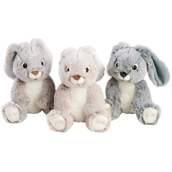 Adorable peluche lapin assis de 20 cm. 3 modèles assortis : taupe, beige ou gris. Convient dès la naissance. 100% polyester.