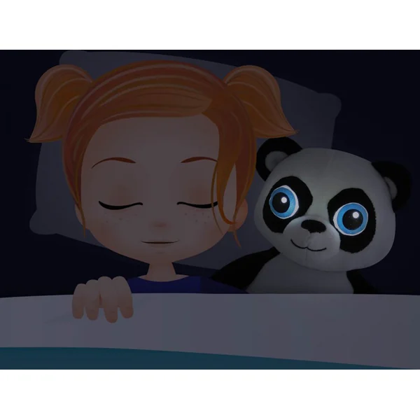 Un doux peluche qui s’endort avec des yeux légèrement lumineux.