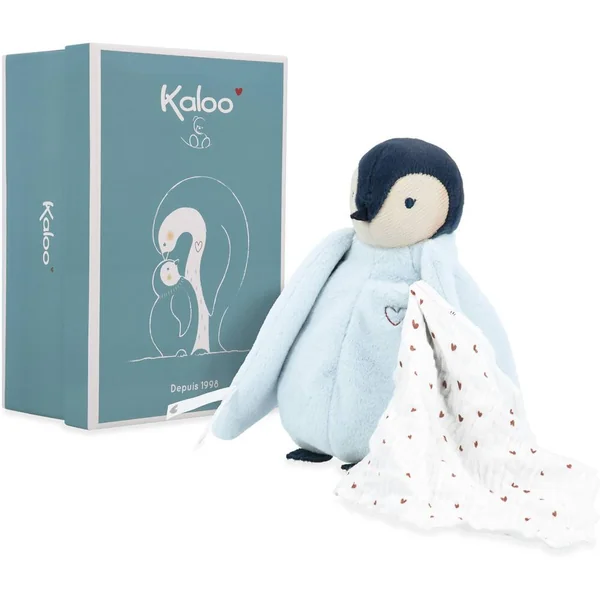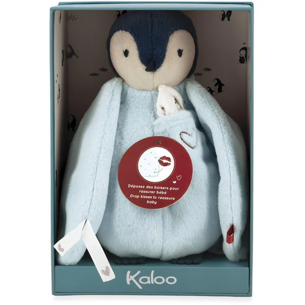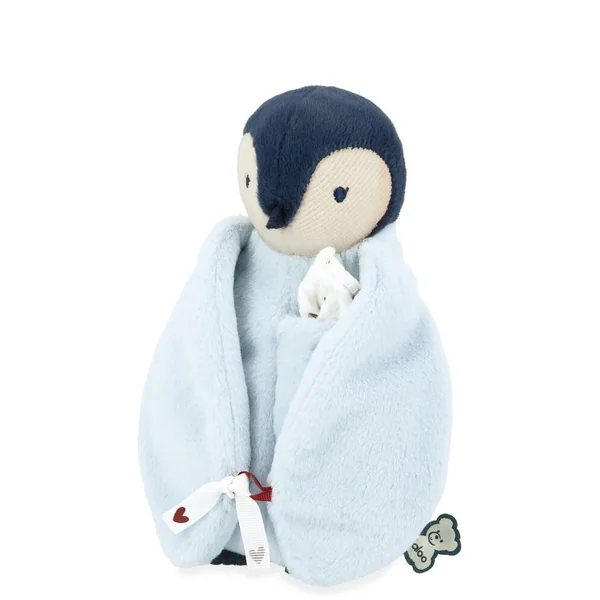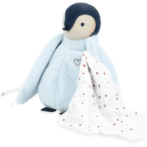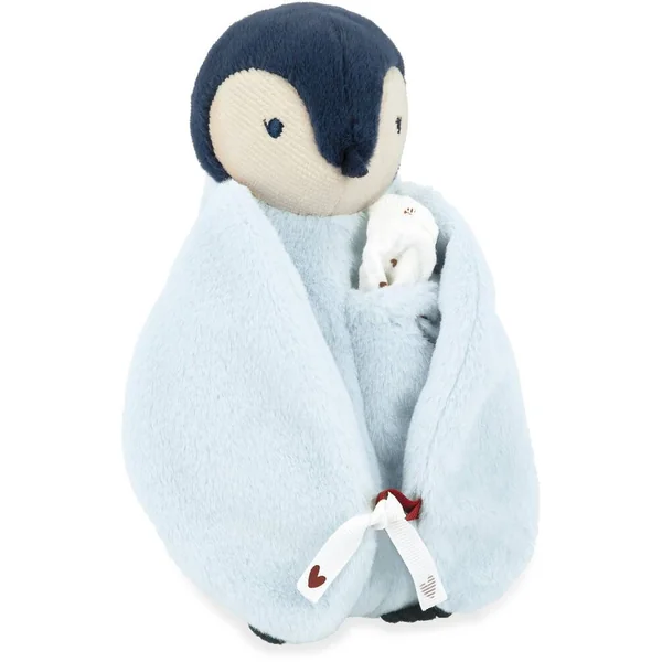 Ce tendre manchot bleu tout doux de 20 cm de hauteur, est toujours prêt à réconforter bébé lors des moments de séparation. En fourrure extra douce avec une poche sur son cœur qui contient un long mouchoir en mousseline de coton pour s’imprégner des odeurs des parents où pour y déposer des baisers. Ils pourront ainsi mettre près d’eux la peluche afin que celle-ci maintienne leur odeur et puisse envelopper bébé dans une vague de réconfort quand il la prendra. Les ailes du manchot se nouent entre elles par des rubans ornés d’un joli cœur, symbolisant ainsi la protection et le lien d’attachement. Il est présenté dans une jolie boîte cadeau personnalisable et qui peut être réutilisée comme étui de rangement. Lavable en machine à 30°. Rembourrage en polyester recyclé. Dès la naissance.