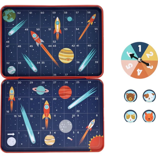 Ce jeu spatial commence ! Un jeu amusant dans une boîte en métal pleine d’illustrations joyeuses. Le jeu est une version spatiale de Serpents et échelles. Alternez pour faire tourner la flèche, elle indique de combien de cases vous avancez. Si vous vous arrêtez sur une case avec du carburant en feu de la fusée, avancez vers le corps de la fusée. Essayez d’éviter la queue de la comète, si vous vous arrêtez sur une telle case, vous tombez sur son noyau. Emballé dans une boîte en métal recyclable, avec une ouverture à charnière. Convient pour 2-4 joueurs
