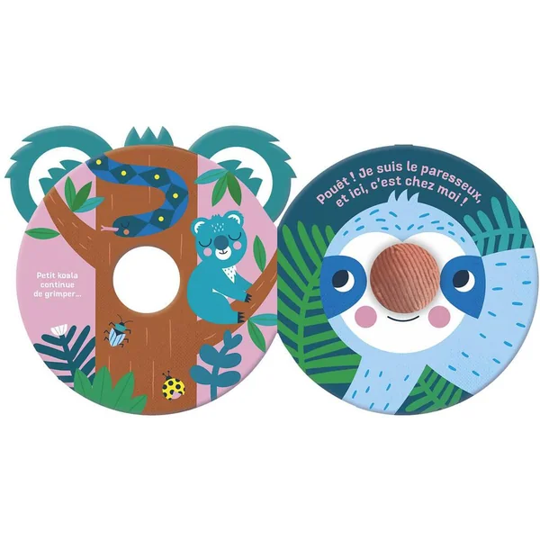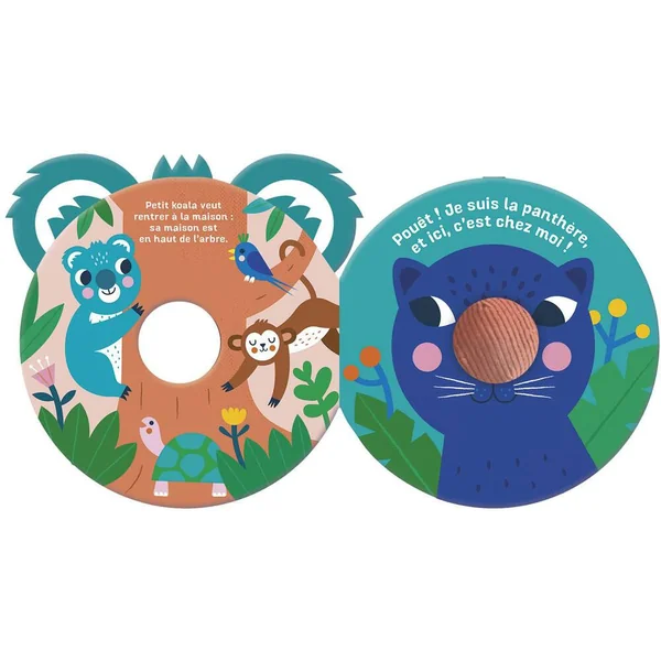 Un livre tissu rond très doux, en forme de tête d’animal, avec gros nez en volume en velours contenant un élément sonore.