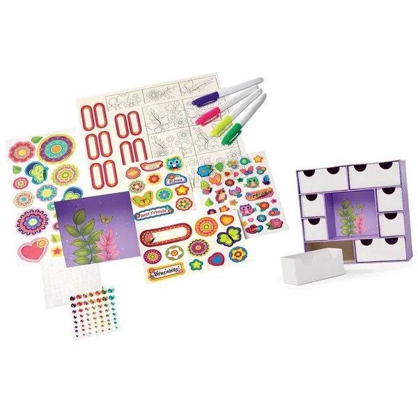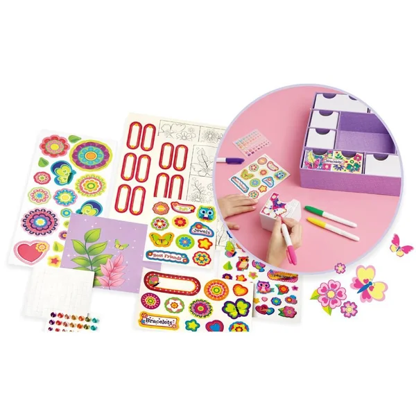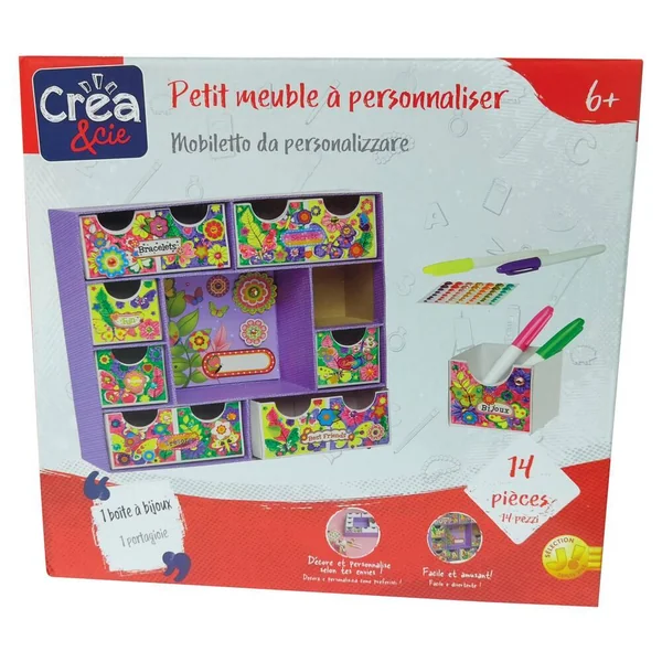 Décore et personnalise selon tes envies ce petit meuble de rangement ! Il pourra devenir par exemple ta boîte à bijoux (bijoux non fournis). Nombreux accessoires dont : 1 boîte à bijoux, 3 feuilles d’autocollants décoratifs, 1 feuille de décoration à découper, 4 feutres de couleur, 1 jeu d’autocollants de graffiti, des autocollants de gemmes, des autocollants mousse. Instructions incluses. Facile et amusant !