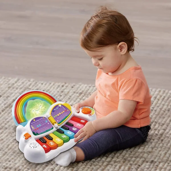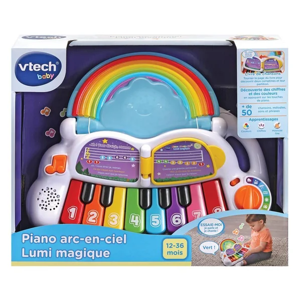 Piano arc-en-ciel Lumi Magique. De 12 à 36 mois. 8 touches colorées pour jouer de la musique mais aussi découvrir les chiffres et les couleurs. 2 pages de partitions pour de nombreux apprentissages en chanson. Magique ! Le nuage orientable s’illumine au rythme des notes de musique. 7 sons et instruments différents à sélectionner pour varier les mélodies. 3 jeux. 3 chansons et 17 mélodies. Arrêt automatique. Pile de démonstration fournie