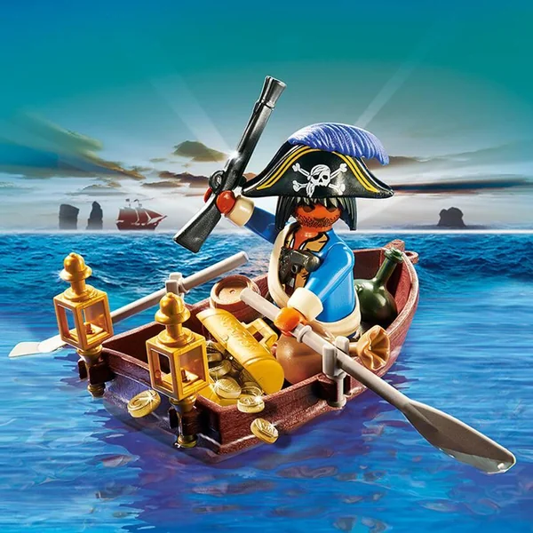 Pirate avec barque et de nombreux accessoires (lanterne, coffre avec pièces d’or, baluchon, tonneau et bouteille).