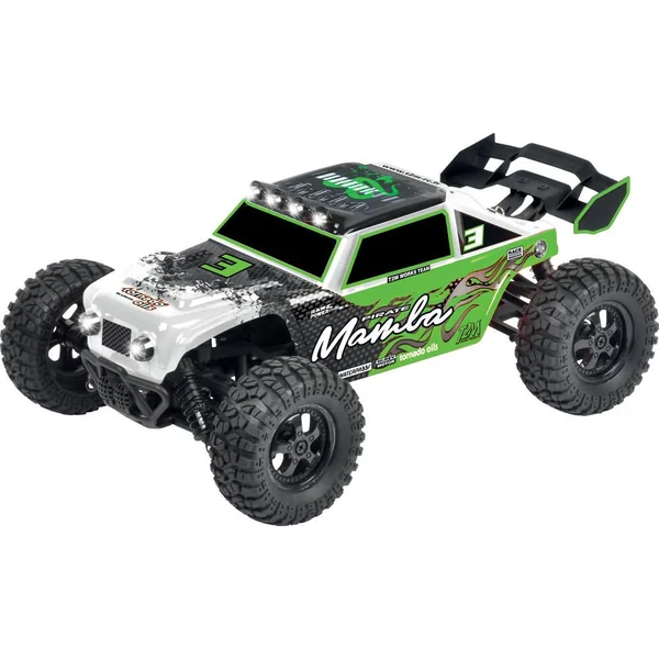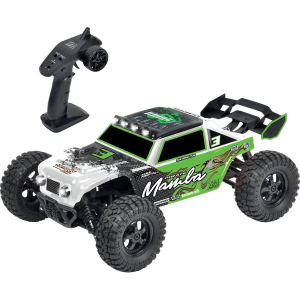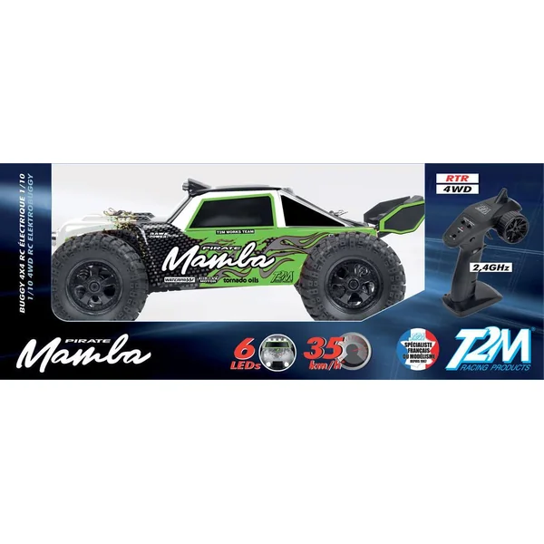 Buggy RC tout-terrain 4×4 1/10ème. Puissant moteur type 390, transmission à 2 différentiels sur roulements à billes. Éclairage : 6 LEDs. Waterproof. Émetteur volant/gâchette ergonomique : 2,4 GHz. Vitesse maxi. : 35 km/h. Livré avec 2 accus Li-Ion 3,7 V et chargeur USB.