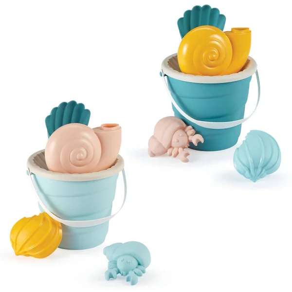 Seau garni 17 cm en forme de coquillage garni d’une pelle, d’un arrosoir en forme d’escargot de mer et de deux moules.