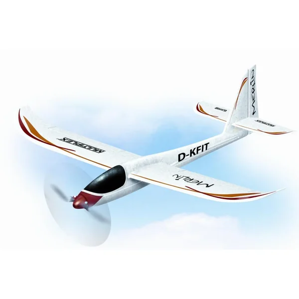 Boîte de construction: Eléments moulés du fuselage, des ailes et de l’empennage en ELAPOR®. Longeron/clé d’aile en tube aluminium et fuselage avec gaines de commande. Toutes les petites pièces plastiques nécessaires au montage et aux tringles de commande, cône, plateau Ø3,2mm, hélice à pales repliables 7×4″, planche de décoration prédécoupée (verte) et notice détaillée.