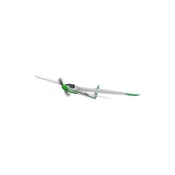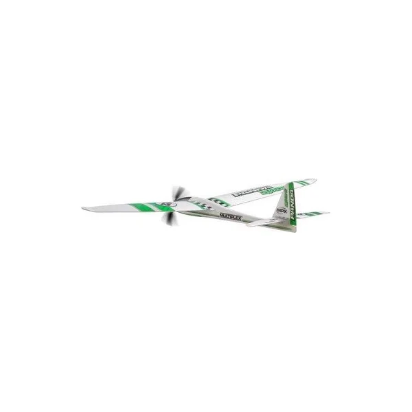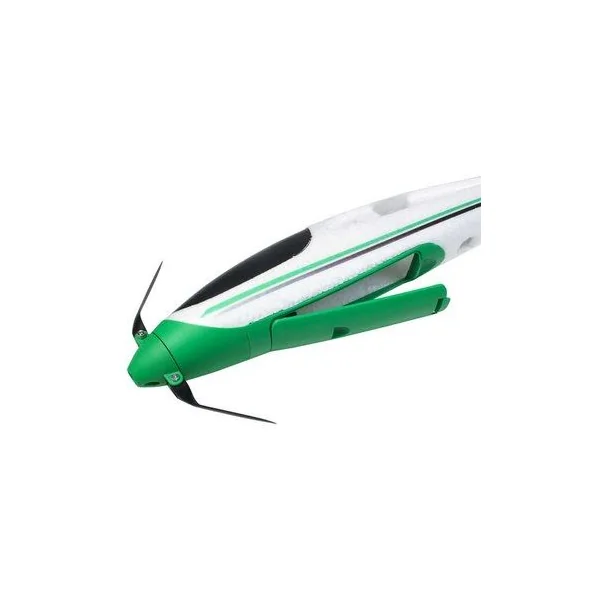 Modèle en ELAPOR® monté à 100%, avec moteur PERMAX BL-O 2812-1100 et variateur MULTIcont BL-20 SD, hélice à pales repliables 7×4″ montée, 2 servos Nano-S, décoration posée (verte) et notice détaillée.