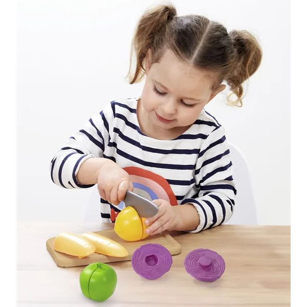 Planche à découper avec couteau et légumes.