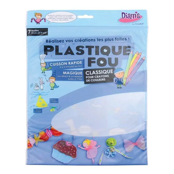 Toutes les créations sont possibles avec le plastique fou : porte-clés, ronds de serviette, guirlandes, marque-pages, bijoux, boutons, décorations. Un dessin sur une feuille de plastique qui rétrécit et s’épaissit au four jusqu’à 7 fois et votre création prend vie. Le plastique fou transparent permet de décalquer facilement un motif. On peut le colorer avec des feutres permanents.