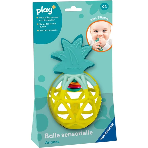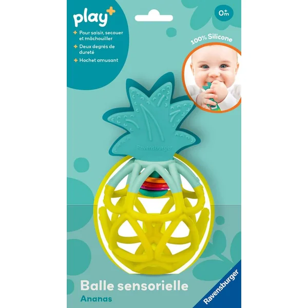 Adaptée aux bébés à partir de 6 mois,la balle sensorielle Ananas offre aux bébés beaucoup d’amusement ! A base de silicone souple, les bébés peuvent facilement attraper ce jouet multi sensoriel, le faire rouler et le lancer. Son design incite le bébé à jouer, et à développer sa motricité fine. Elle peut être nettoyée au lave vaisselle. Elle est coiffée d’une feuille de dentition, qui va accompagner les bébés lors des poussées dentaires ainsi qu’apaiser leurs gencives. Avec notre nouvelle gamme de jouets et de livres Play+ pour les enfants de 0 à 3 ans, nous proposons des produits adaptés à la petite enfance combinée à l’expérience de Ravensburger. Développés avec l’exigence de qualité de Ravensburger, nos livres et jouets plaisent aux enfants tout en leur permettant d’apprendre et de découvrir en s’amusant.Notre approche du jeu nous a amené à définir une gamme qui répond également aux besoins des parents, et chaque produit a un plus !
