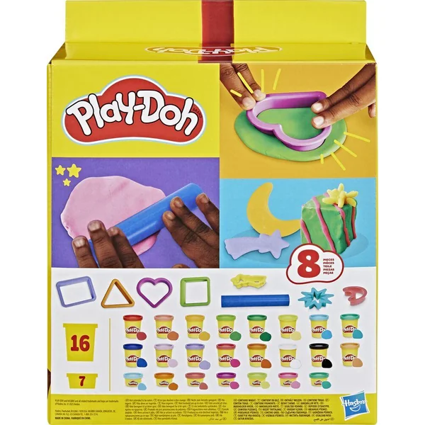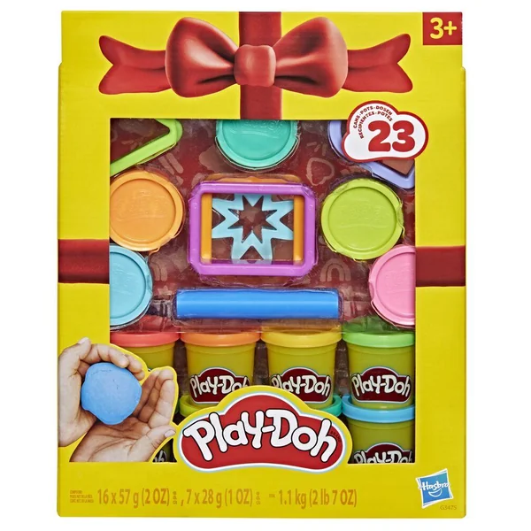 On offre le cadeau de l’imagination avec un Coffret cadeau Play-Doh ! On peut stimuler la créativité des enfants avec 23 pots de pâte à modeler et 8 accessoires Play-Doh. Inclut 7 emporte-pièces en forme de triangle, de rectangle, de carré, de cœur, de lune, de comète et d’étoiles. Le rouleau permet aux enfants d’aplatir la pâte pour pouvoir utiliser les emporte-pièces. Inclut un arc-en-ciel de couleurs Play-Doh en pots de 28 g et de 56 g ainsi que du noir, du blanc et du marron pour ajouter de petits détails. PLAY-DOH, HASBRO et toutes les marques et logos associés sont des marques de commerce de Hasbro, Inc.