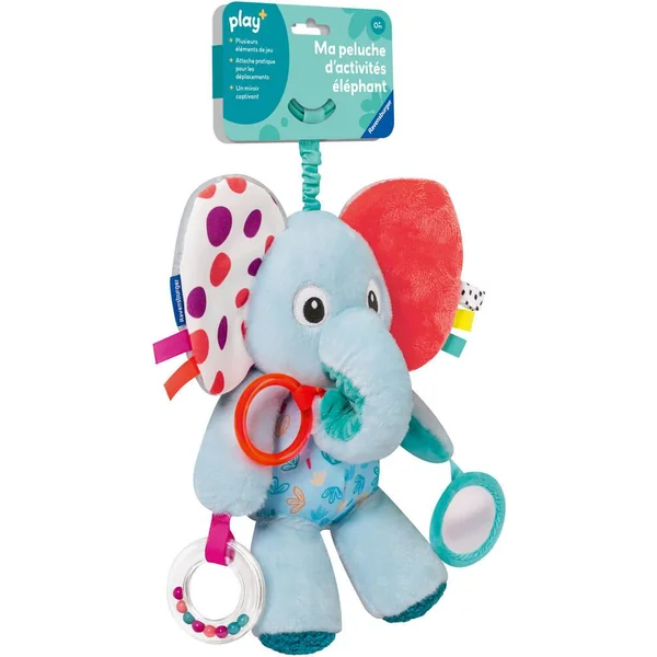 La peluche d‘activités éléphant a de nombreux effets ludiques ! En plus du bruit de papier froissé, il y a des boucles, des tissus doux et des textures à toucher et à découvrir. La trompe de l’éléphant s’enroule automatiquement lorsqu’elle est relâchée. Cela incite les bébés à tirer encore et encore et stimule la motricité fine de manière ludique.Un vrai compagnon de jeu et de manipulation pour découvrir tout en douceur et stimuler tous les sens. Avec notre nouvelle gamme de jouets et de livres Play+ pour les enfants de 0 à 3 ans, nous proposons des produits adaptés à la petite enfance combinée à l’expérience de Ravensburger. Développés avec l’exigence de qualité de Ravensburger, nos livres et jouets plaisent aux enfants tout en leur permettant d’apprendre et de découvrir en s’amusant.Notre approche du jeu nous a amené à définir une gamme qui répond également aux besoins des parents, et chaque produit a un plus !