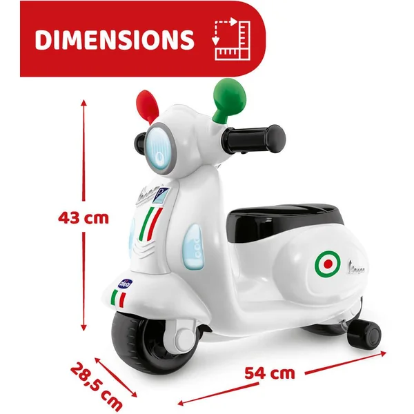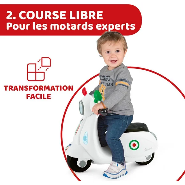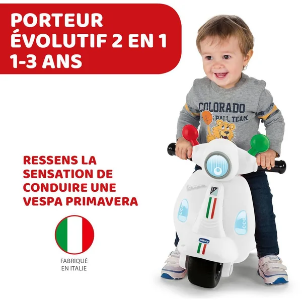 Un porteur au look inconique du scooter Vespa Primavera avec petites roues amovibles ! Son guidon est un centre d’activités électroniques avec lumières et sons !