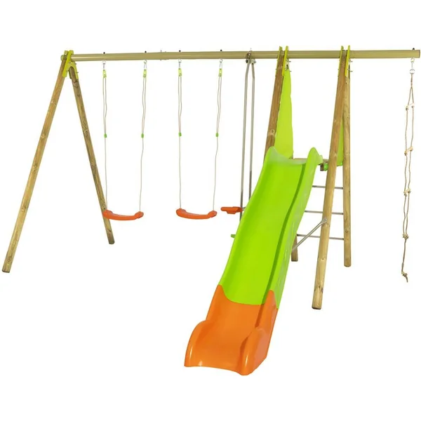 Portique en bois et métal de 2.30 m de haut. Équipé d’une échelle de corde, de deux balançoires identiques, d’un face à face, d’une plateforme de 1.20 m de haut et d’un toboggan de 2.63 m de glisse de coloris vert et orange. Balançoires et face à face en plastique soufflé. Echelle de corde de 2.25 m de long : corde en polypropylène et barreaux en bois. Largeur intérieur du toboggan : 26 cm. 1 seul utilisateur à la fois par agrès. Poids maximum de chaque utilisateur : 50 kg par agrès, pour le toboggan et pour la plateforme. Utilisation en extérieur. Instructions incluses. L’assemblage doit être effectué par un adulte. Réservé à un usage familial. A utiliser sous la surveillance d’un adulte.