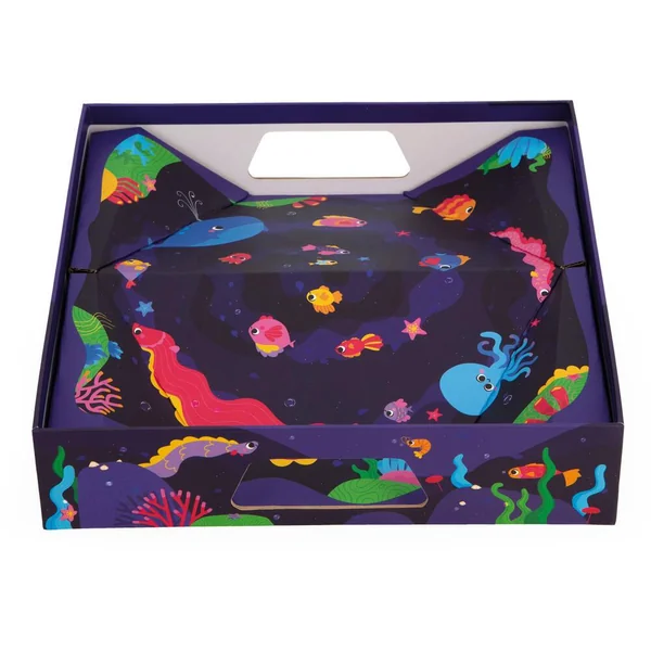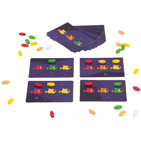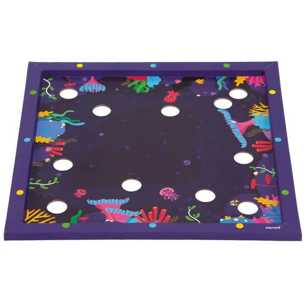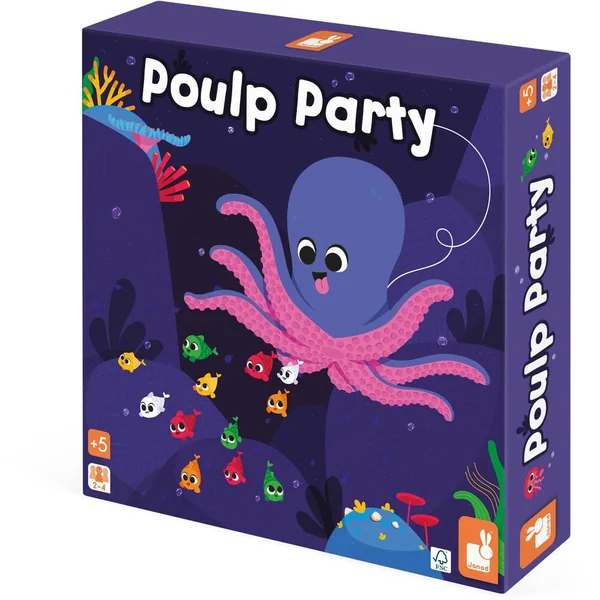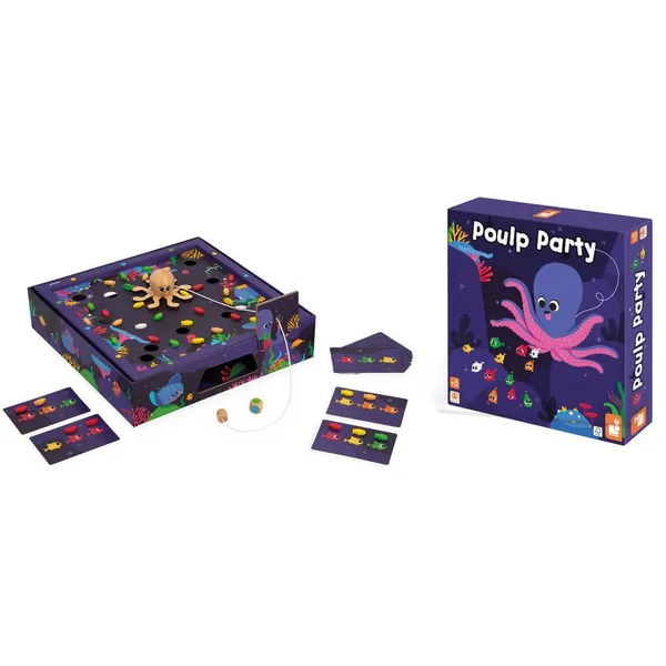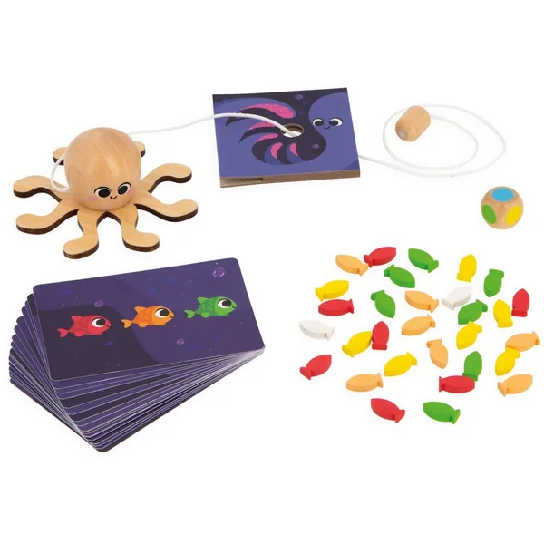 Jeu de stratégie La pieuvre a passé commande pour son déjeuner ! Récupérez les poissons indiqués sur vos cartes missions, en tirant sur la ficelle ! La ficelle fait bouger la pieuvre qui fait tomber les poissons dans les trous…. Il vous faudra un peu de stratégie, un peu d’adresse et un peu de chance pour être le premier à collecter le repas de la pieuvre ! Contient : 1 mer agitée (fond de boite), 1 pieuvre en bois pilotée par une ficelle, 1 dé coloré, 20 cartes missions et 30 poissons en bois à récupérer. Jeu en carton et en bois FSC™. Pour les enfants à partir de 5 ans. 2 joueurs et plus.