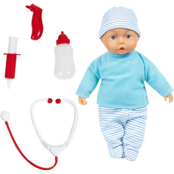Poupée interactive de 33 cm avec une vingtaine de fonctions. Si tu appuies sur son ventre, tu peux entendre des sons réalistes de bébé. Un thermomètre, une seringue, un stéthoscope et un biberon sont inclus dans le coffret. Coffret très amusant pour les jeunes enfants. 3 piles boutons (LR44) fournies. Notice incluse.