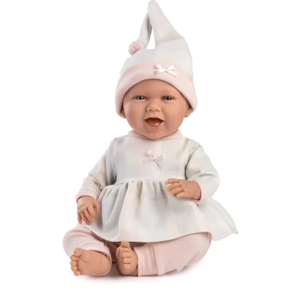 Poupée souriante de 40 cm, en vinyle et au corps souple rembourré. Avec bras et jambes articulés. Elle porte une robe à manches longues, une paire de leggins et un bonnet. Livré avec une sucette. Fabriqué en Espagne. Matières des vêtements : 100% polyester. Vêtements : lavage à la main préconisé.