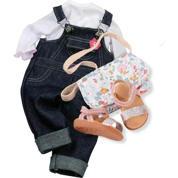 • une tenue décontractée (jeans avec bretelles, t-shirt à manches longues, sac et sandales)