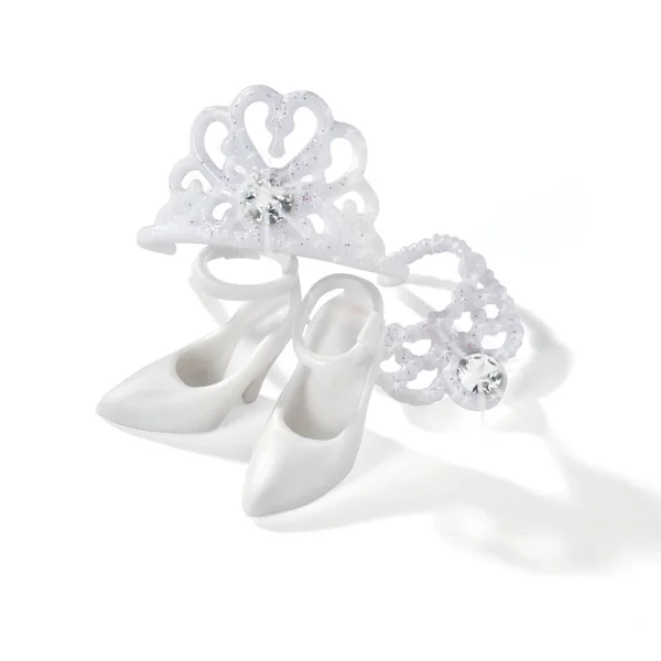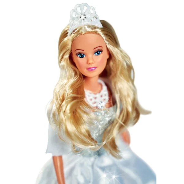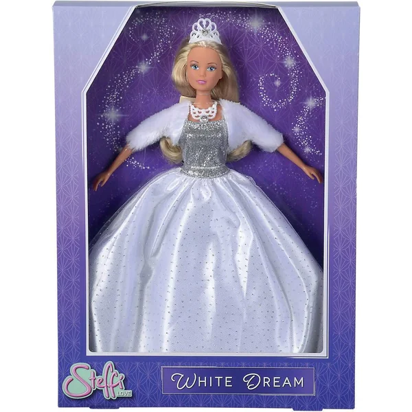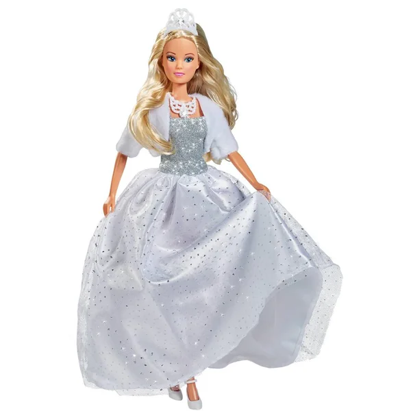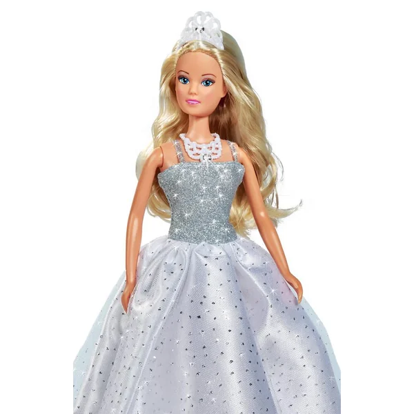 Poupée mannequin Steffi 29cm. Steffi porte une robe blanche glamour à paillette, une tiare, un collier et une veste en fausse fourrure.