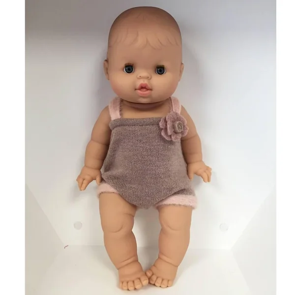 Poupée sexuée : bébé fille. Elle porte une barboteuse. En vinyle. Poupée parfumée à la vanille.