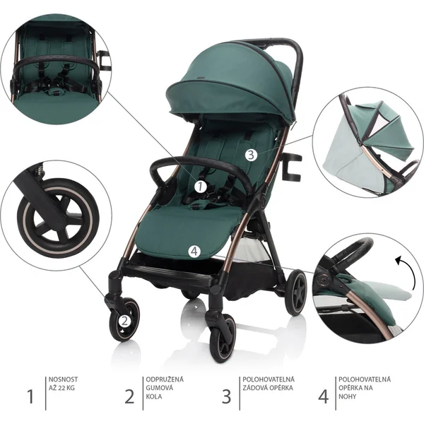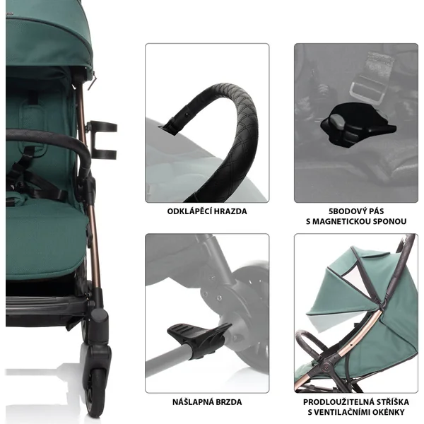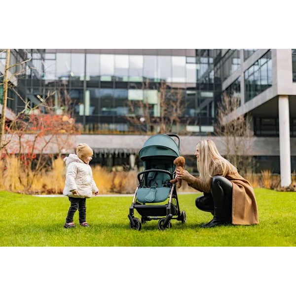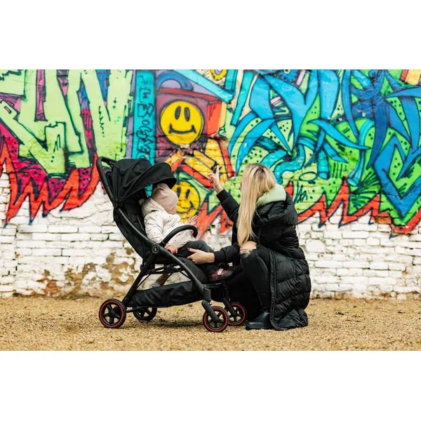 Le siège sportif rembourré est équipé d’un harnais de sécurité à 5 points avec une boucle magnétique. La barre de protection matelassée de la poussette peut être rabattue pour faciliter l’installation de l’enfant. Le canopy extensible avec fenêtres de ventilation protège l’enfant du soleil et du vent. Un panier est inclus, capable de supporter jusqu’à 3 kg d’objets pratiques à avoir à portée de main lors des voyages.