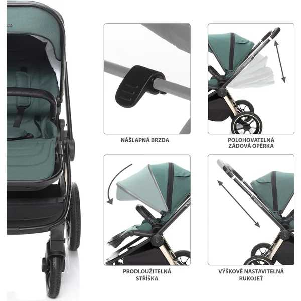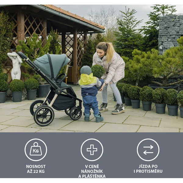 Elle peut transporter des enfants jusqu’à 22 kg. Le confort lors des sorties est assuré par un siège spacieux et rembourré avec une ceinture de sécurité à cinq points réglable en hauteur. Le dossier ventilé est inclinable jusqu’à la position allongée, et le repose-pieds est également réglable.
