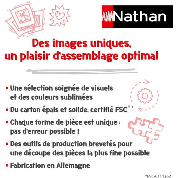 À travers huit collections Évasion, Urbain, Tendresse, Vie sauvage, Artiste, Nostalgie, Photo d’Art et Mes Héros, Nathan dévoile une sélection raffinée d’images inédites et originales, pour répondre à toutes les envies de puzzle. Forte de son savoir-faire dans le livre, la marque Nathan élabore ses puzzles à partir d’images choisies avec le plus grand soin, pour leur qualité, leur dimension symbolique ou les émotions qu’elles suscitent. Pour les puzzleurs entraînés, le format 1000 pièces est idéal pour profiter de cette activité, propice au calme et à la relaxation.Nos puzzles sont parfaits pour se détendre après une journée de travail ou d’école et pour passer un bon moment en famille. La qualité des puzzles Nathan est reconnue et appréciée. Faites partie des millions de personnes qui ont goûté au monde ludique des puzzles avec des produits Nathan de qualité. Chaque pièce de puzzle a sa propre forme, elle est ainsi unique, et elles s’assemblent parfaitement entre elles.