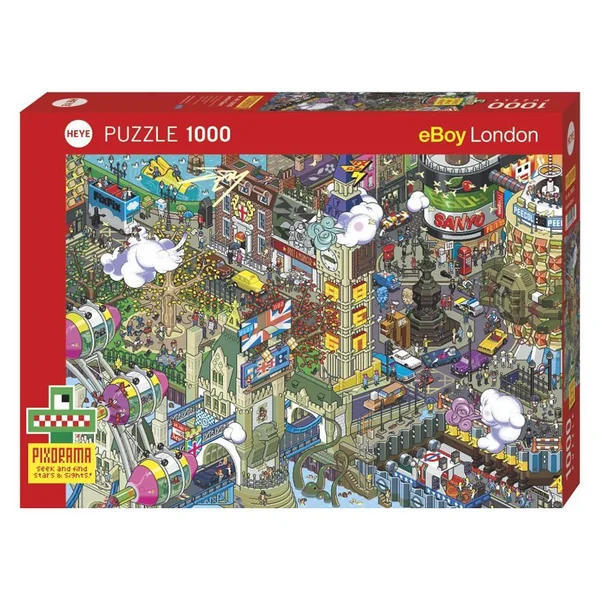 Puzzle 1000 pcs London Quest de la marque Heye, de la série : Pixorama et de l’artiste : eBoy – Dimensions du puzzle monté : 50 x 70 cm.