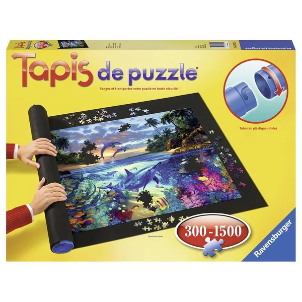 Grâce à ce système de rangement pratique, vous pouvez aussi bien transporter que ranger vos puzzles en cours ou terminés pour gagner de la place. Ces tubes en plastique de grande qualité sont extrêmement solides et permettent d’enrouler les puzzles encore plus facilement. Mode d’emploi : 1. Réalisez votre puzzle directement sur le tapis antiglisse. 2. Assemblez les 8 gouttières deux par deux (l’une avec un crochet et l’autre avec un billet) pour obtenir 4 sections de tube. Raccordez-les en un seul tube, en les tournant en sens opposés pour les bloquer. 3. Placez le tube à l’extrémité de l’une des largeurs du tapis et enroulez soigneusement la feutrine avec le puzzle autour du tube. 4. Fixez le rouleau avec les élastiques fournis. La feutrine antiglisse maintient toutes les pièces en place. 5. Vous pouvez maintenant transporter ou ranger votre puzzle pour gagner de la place (de préférence couché), sans le moindre risque.