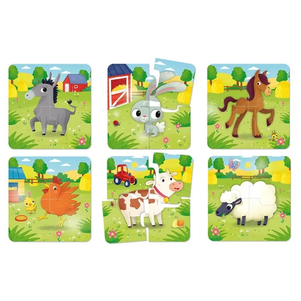 Jeu contenant 8 puzzles sur le thème de la ferme, réalisés en carton très épais. Taille d’un puzzle : 14 cm x 14 cm.